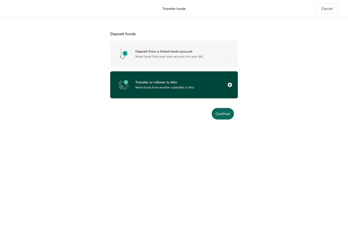 - On the funding options screen, select Transfer or Rollover to Alto, then click Continue.